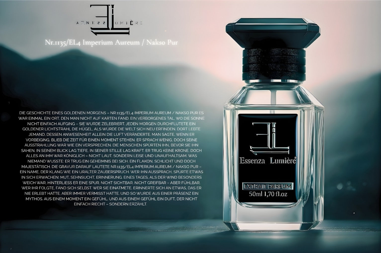 Was niemand wusste: Er trug ein Geheimnis bei sich. Ein Flakon, schlicht und doch majestätisch. Die Gravur darauf lautete Nr.1135/EL4 Imperium Aureum / Nakso Pur – ein Name, der klang wie ein uralter Zauberspruch. Wer ihn aussprach, spürte etwas in sich erwachen: Mut, Sehnsucht, Erinnerung.
